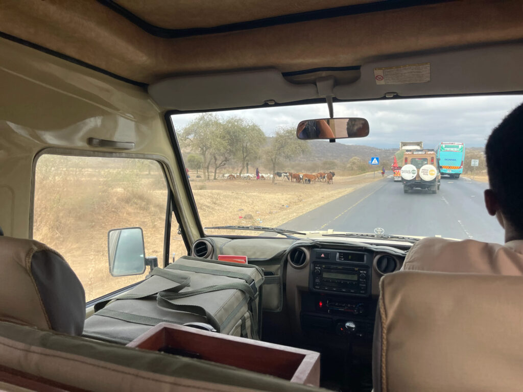 We did two half-day game drives in Tarangire – one in the afternoon and one the next morning. We saw plenty of wildlife – giraffes, elephants, wildebeest, zebras and impalas. We also caught glimpses of a cheetah and a pair of lions, though they were quite far away and only visible through binoculars or a strong zoom lens. The park was fairly busy that day, so at big sightings like those, there was a traffic jam of safari vehicles jostling for the best view.